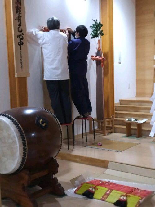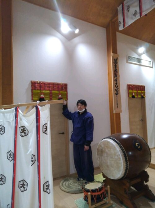 奉賛会員の皆様からの 御奉納 御簾が出来上がりました。奉賛会 会費の中から 御奉納戴き 誠にに感謝御礼を 申し上げます。講長 神主さんで 取り付けを致しました。光がさした様です大国主大神様も 大変 お喜びの事と感じ入りました。