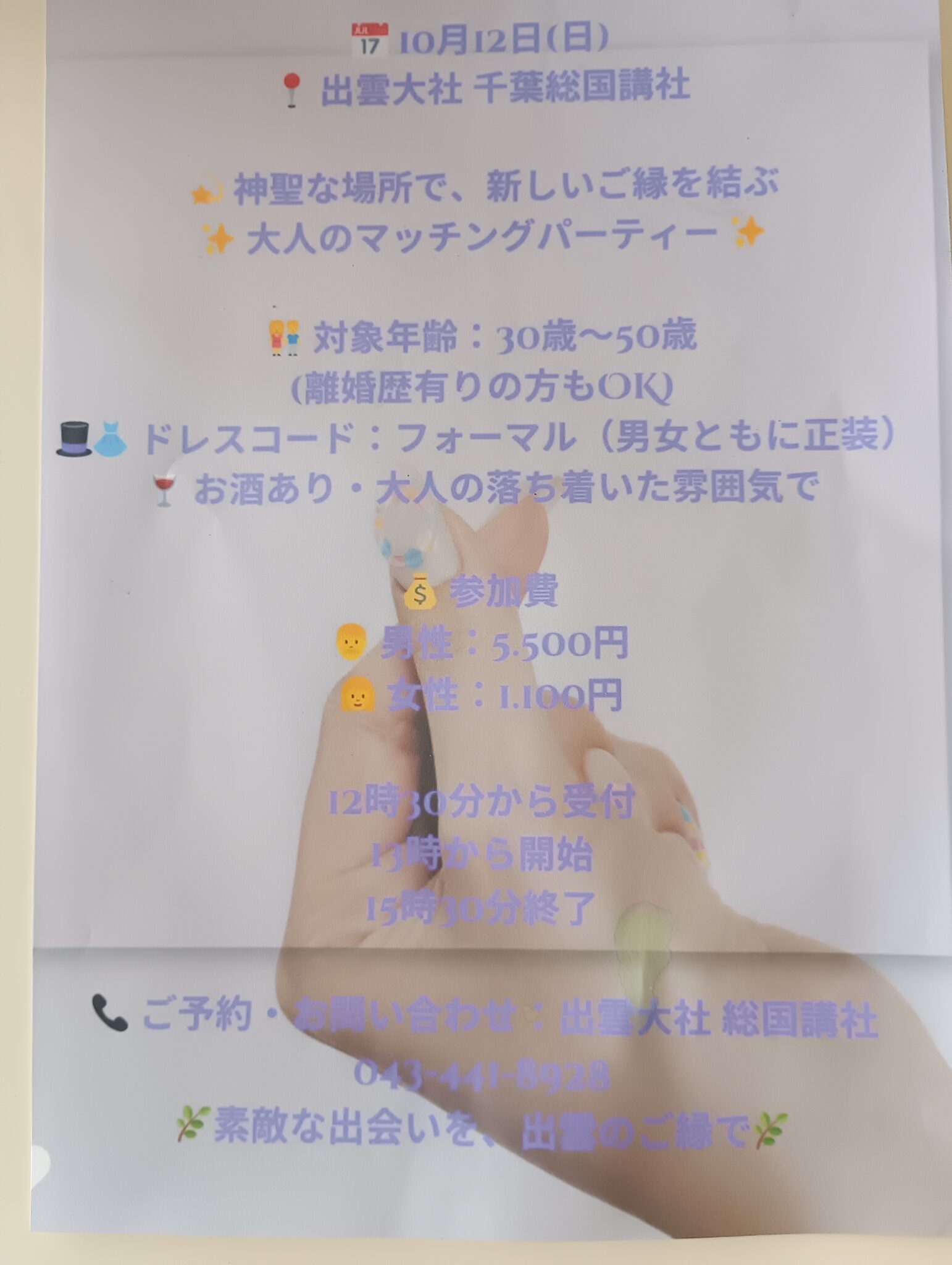 素敵な出会いを 出会いパーティーは、十二時三十分受付、十三時 開始となります。楽しいお時間と御縁に恵まれます事、お楽しみに